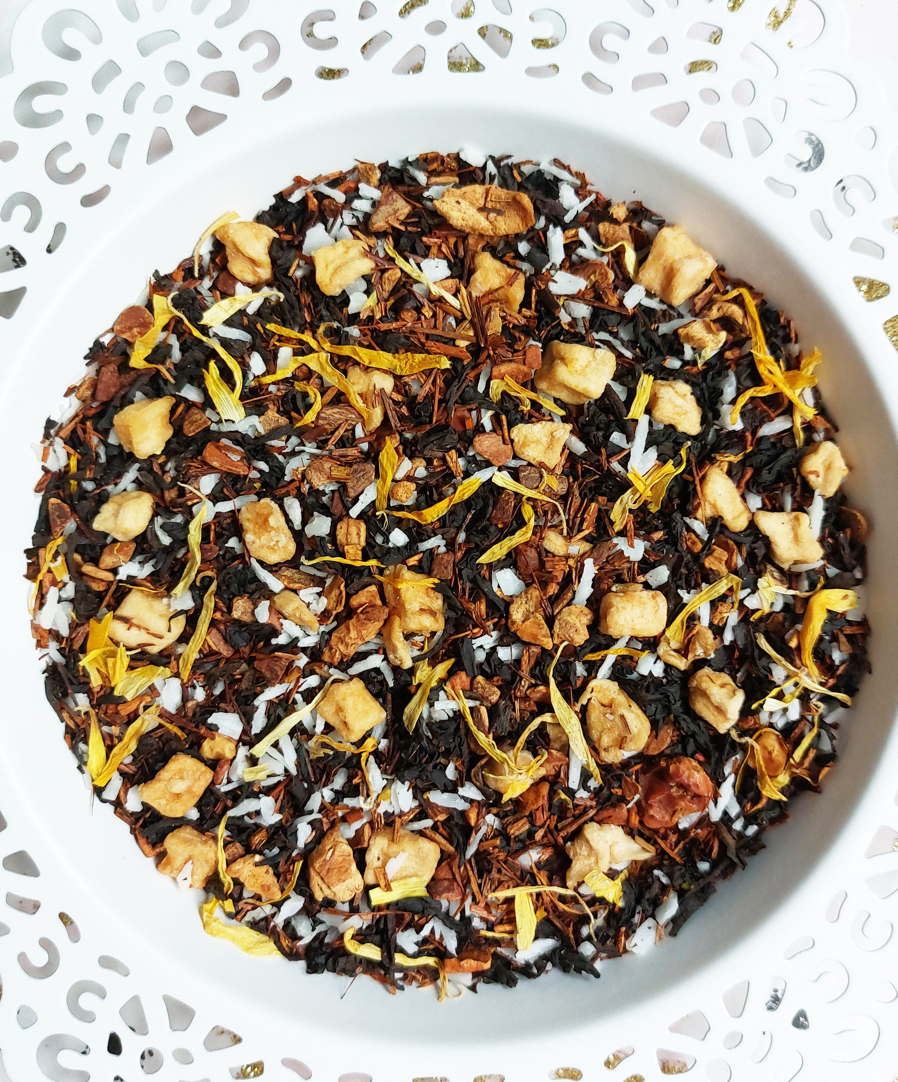 Ingredients: Rooibos, Apple, Black Tea*, Natural Cream Flavour*, Coconut, Cinnamon*, Brown Sugar, Calendula Petals (* = certified organic)