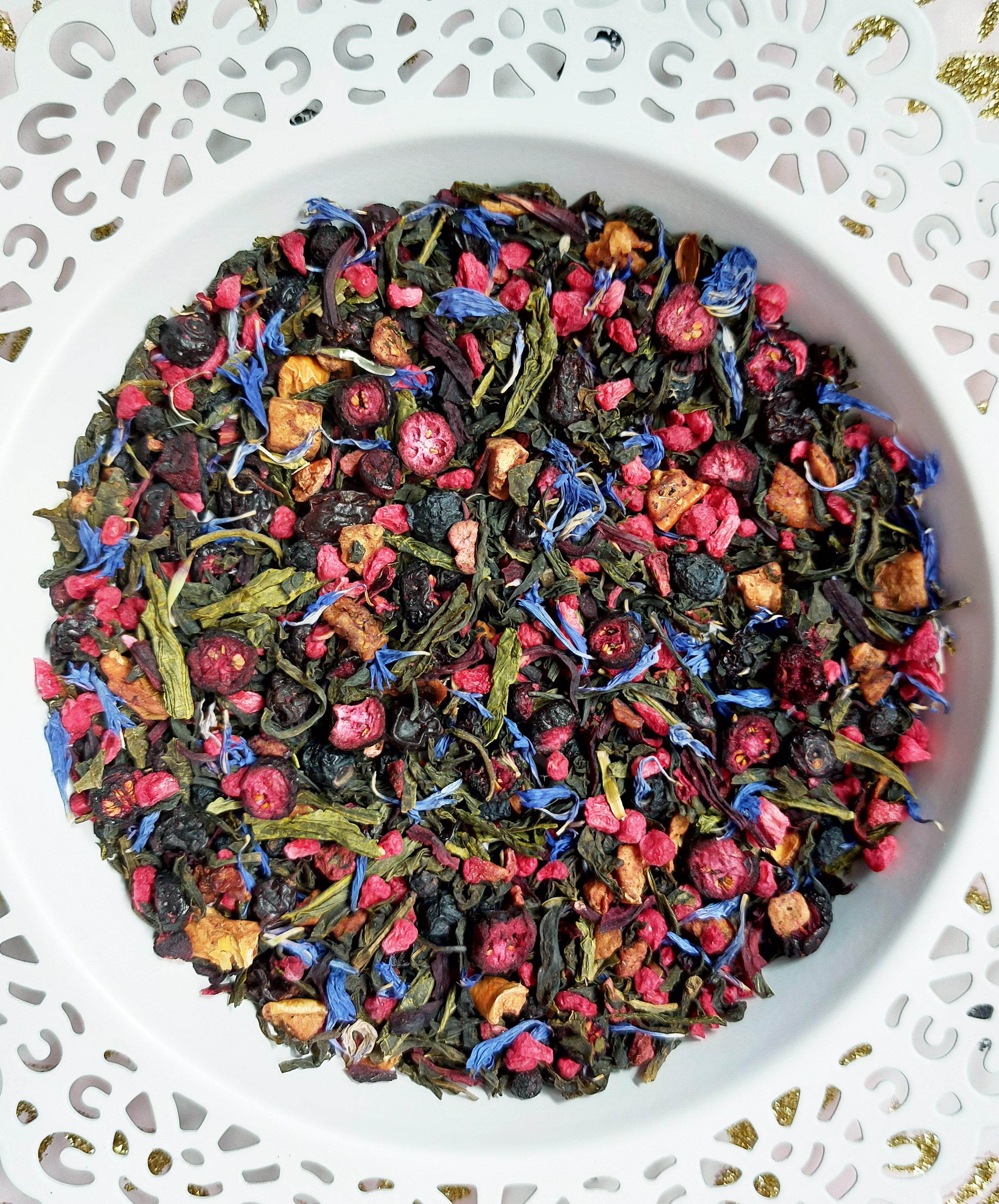 Ingredients: Green Tea, Raspberry Pieces, Apples, Blueberries, Currants, Elderberries, Hibiscus, Freeze-Dried Blueberries*, Freeze-Dried Raspberries, Blue Cornflower Petals (* = certified organic)