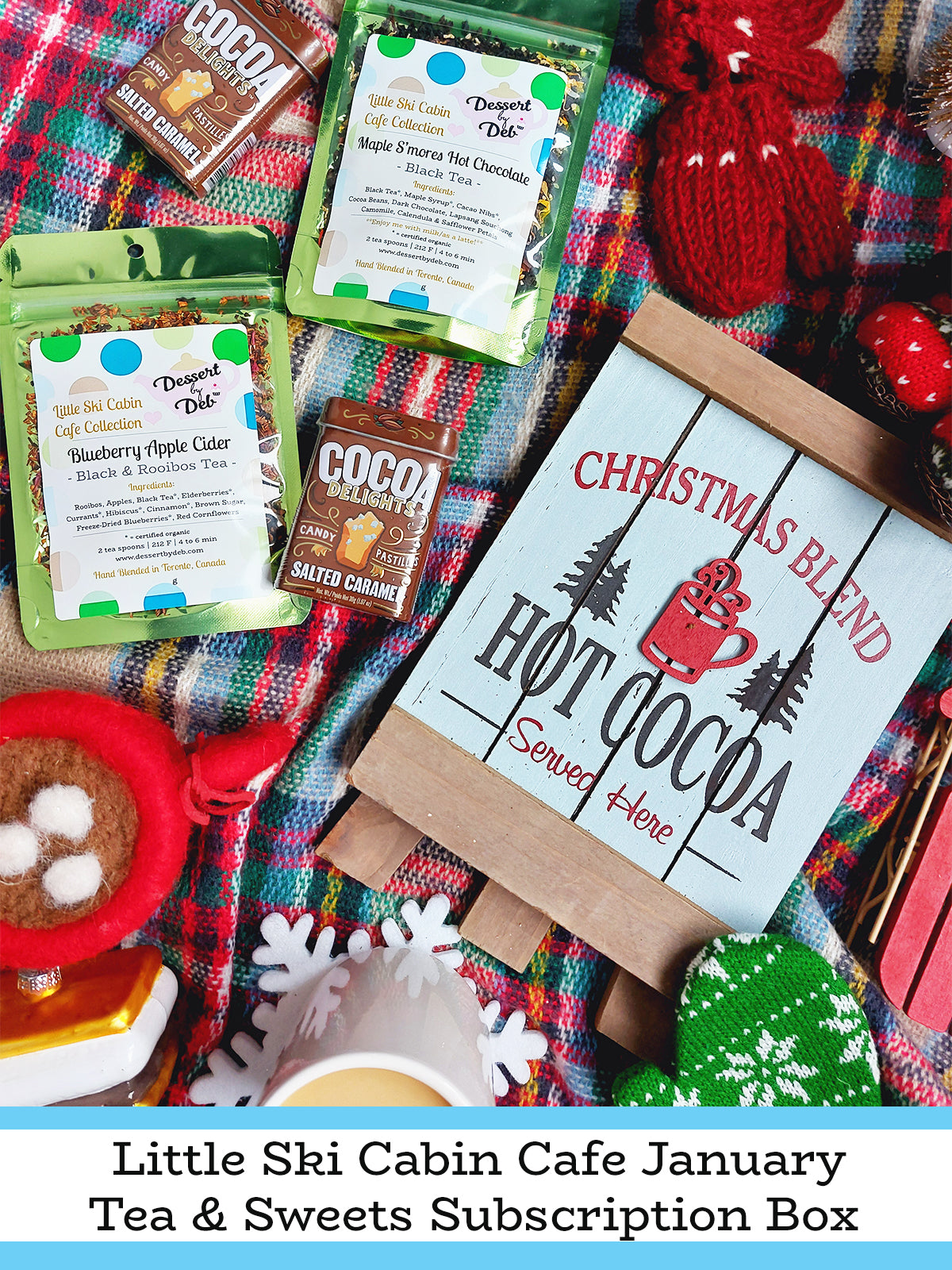 Welcome to the Little Ski Cabin Cafe! Your snowy, winter-white tea and sweets destination to relax and cuddle with the warmest, coziest, and most delicious hot drinks and mouthwatering desserts! The January Little Ski Cabin Cafe monthly tea box is here with 5 brand new teas to celebrate all manner of cozy comfort: fruity ciders and mocktails, cake, cookies, and of course, hot chocolate!
