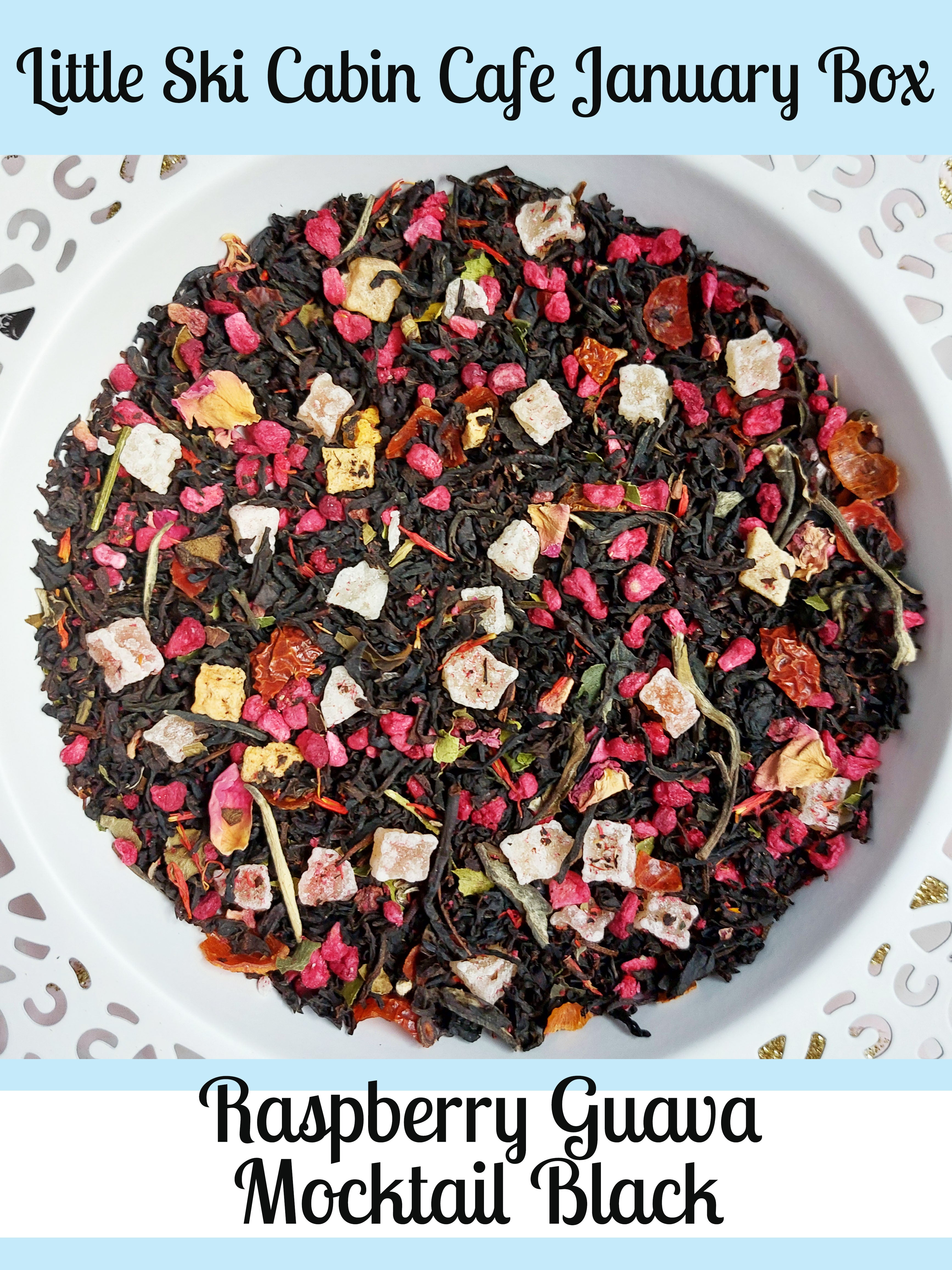 Relaxing at the Little Ski Cabin Cafe this winter means being surrounded by all manner of delicious winter drinks: mochas, hot chocolates, lattes, ciders, and more! But what if we want to get a little fancy at this magical chalet and cafe of ours and have fruity winter punches and drinks in flutes? Enter the Raspberry Guava Mocktail! This bright and dazzling black tea blend is your winter respite featuring ruby raspberries and chunks of papaya and guava fruit. Let's clink glasses (and teacups, pinkies up!) and toast to a bright season and year ahead.