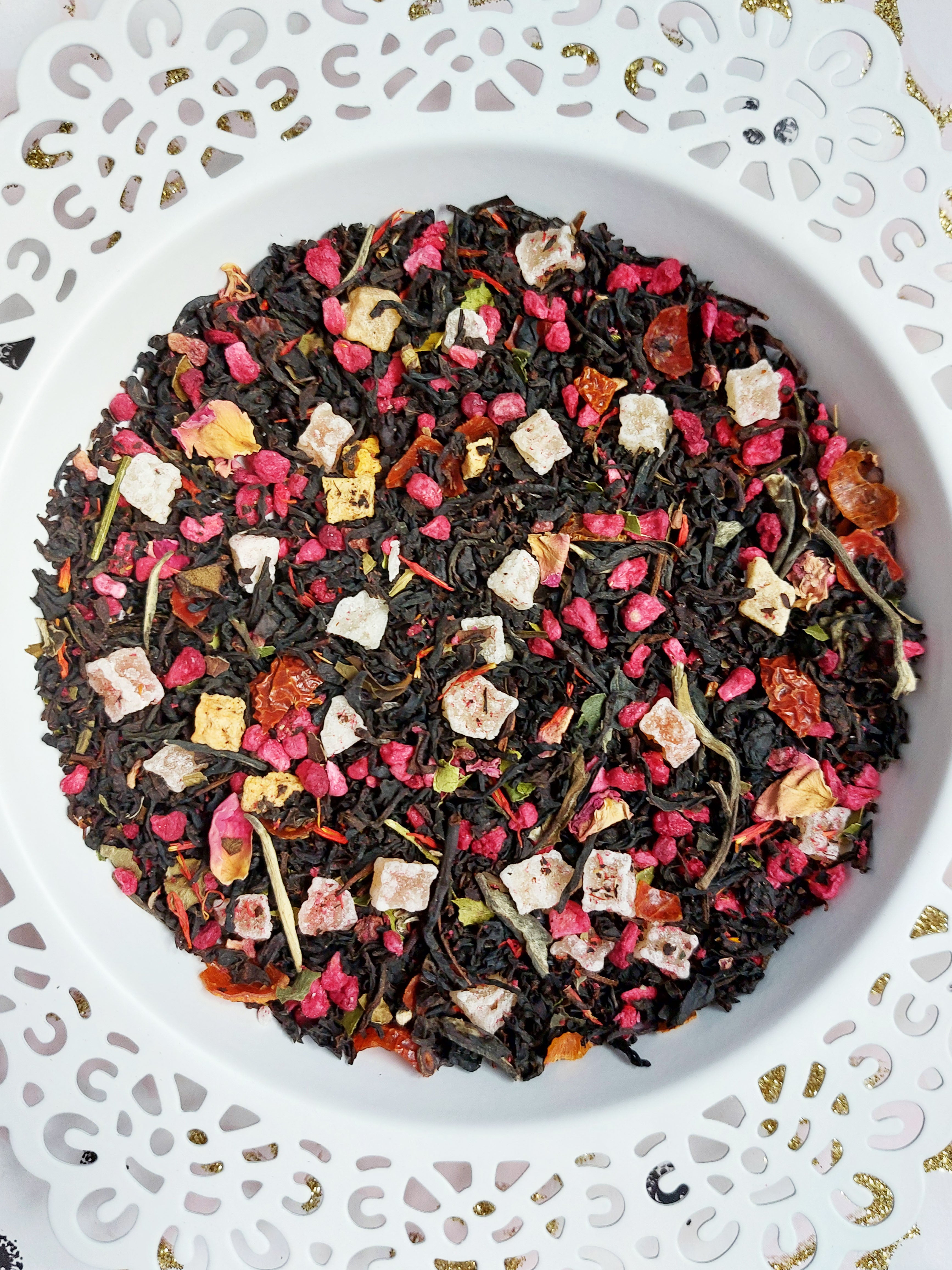Ingredients: Black Tea, Natural Raspberry Flavour, Natural Guava Flavour, Papaya Pieces, Rosehips, Freeze-Dried Raspberries, Mango Pieces, White Tea Leaves, Rose Petals, Safflower, Lime Leaf