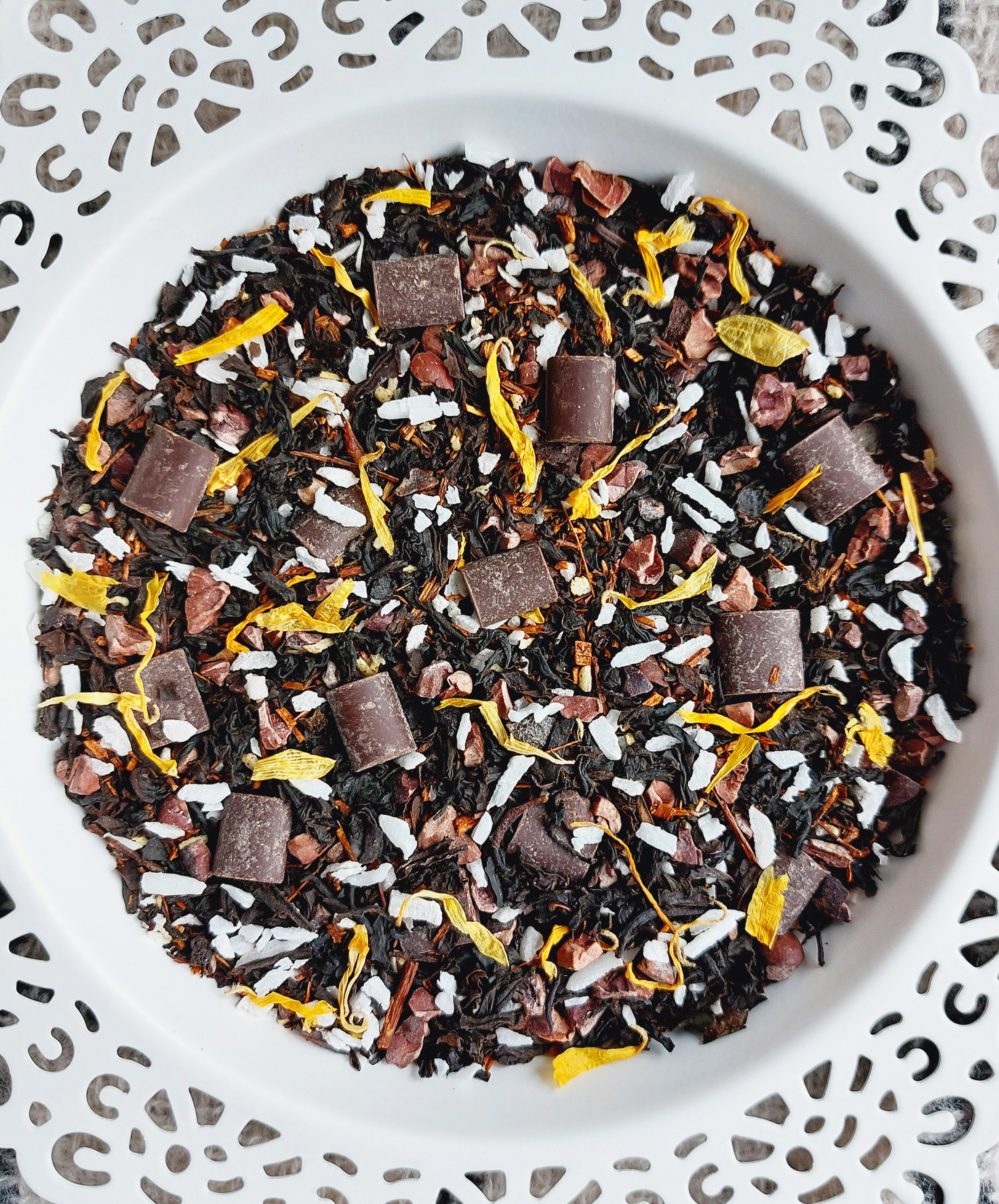 Ingredients: Black Tea*, Coconut*, Cacao Nibs*, Rooibos*, Vanilla*, Dark Chocolate*, Natural Cream Flavour*, Calendula Petals* (* = certified organic)