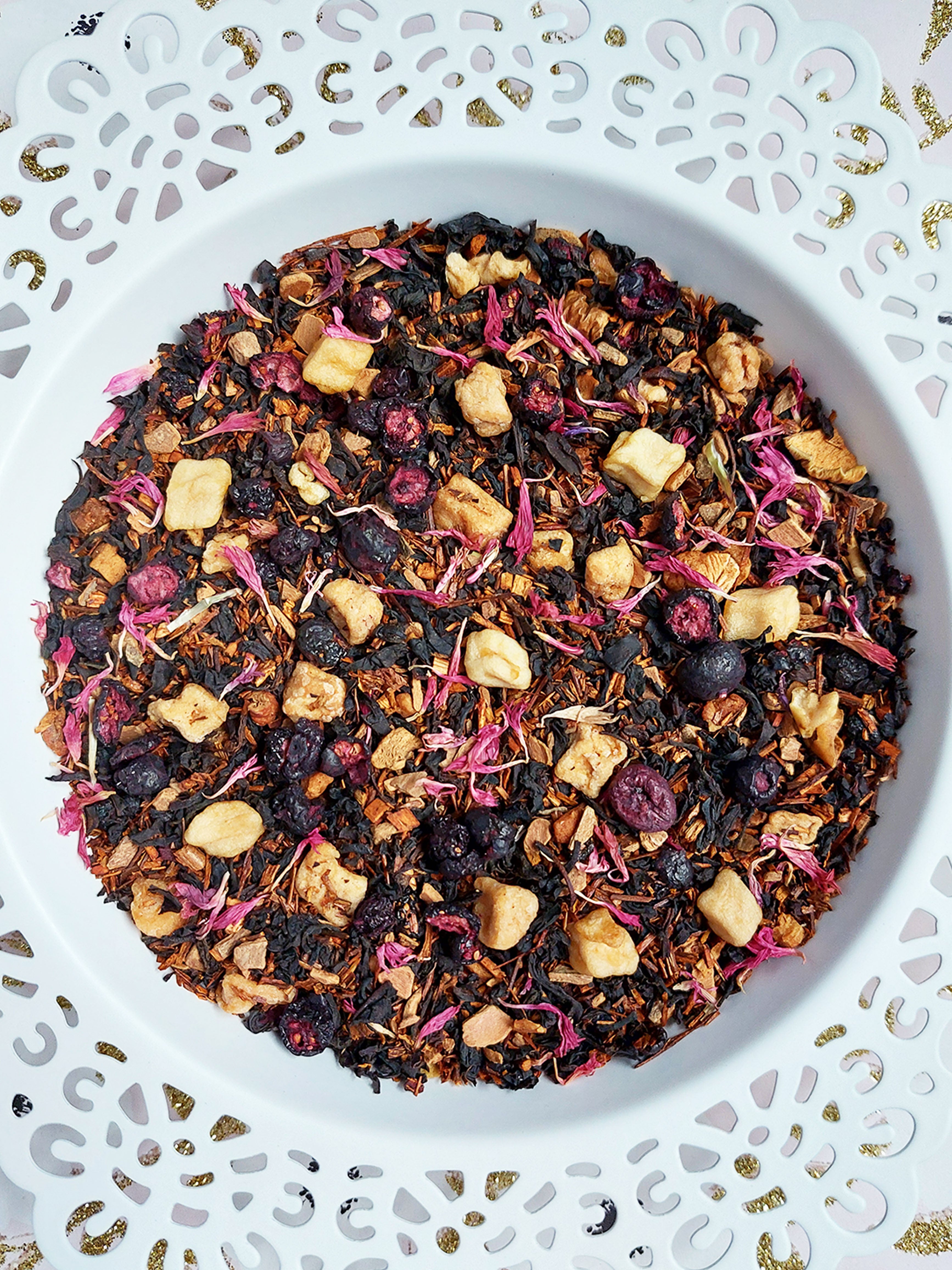 Ingredients: Rooibos, Apples, Black Tea*, Elderberries*, Currants*, Hibiscus*, Cinnamon*, Brown Sugar, Freeze-Dried Blueberries*, Red Cornflower Petals (* = certified organic)